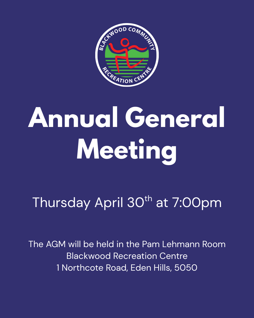 The AGM will be held on Thursday 30th April 2026 at 7:00pm in the Pam Lehmann Room, Blackwood Recreation Centre, 1 Northcote Road, Eden Hills, 5050
